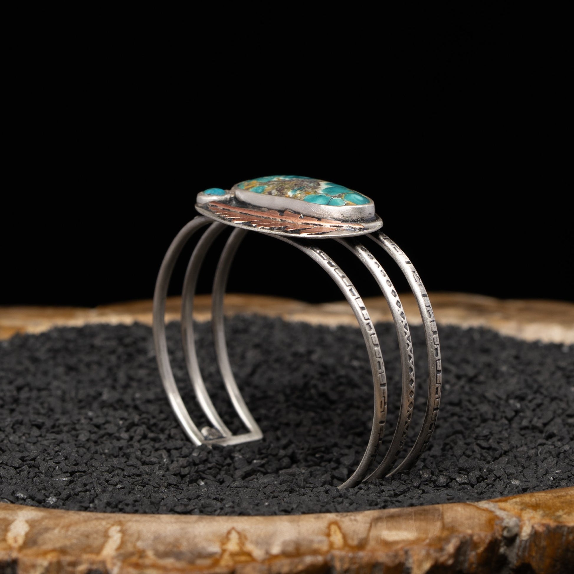 Hand patterned & formed Sterling Silver cuff. Turquoise Stones. Copper fern.