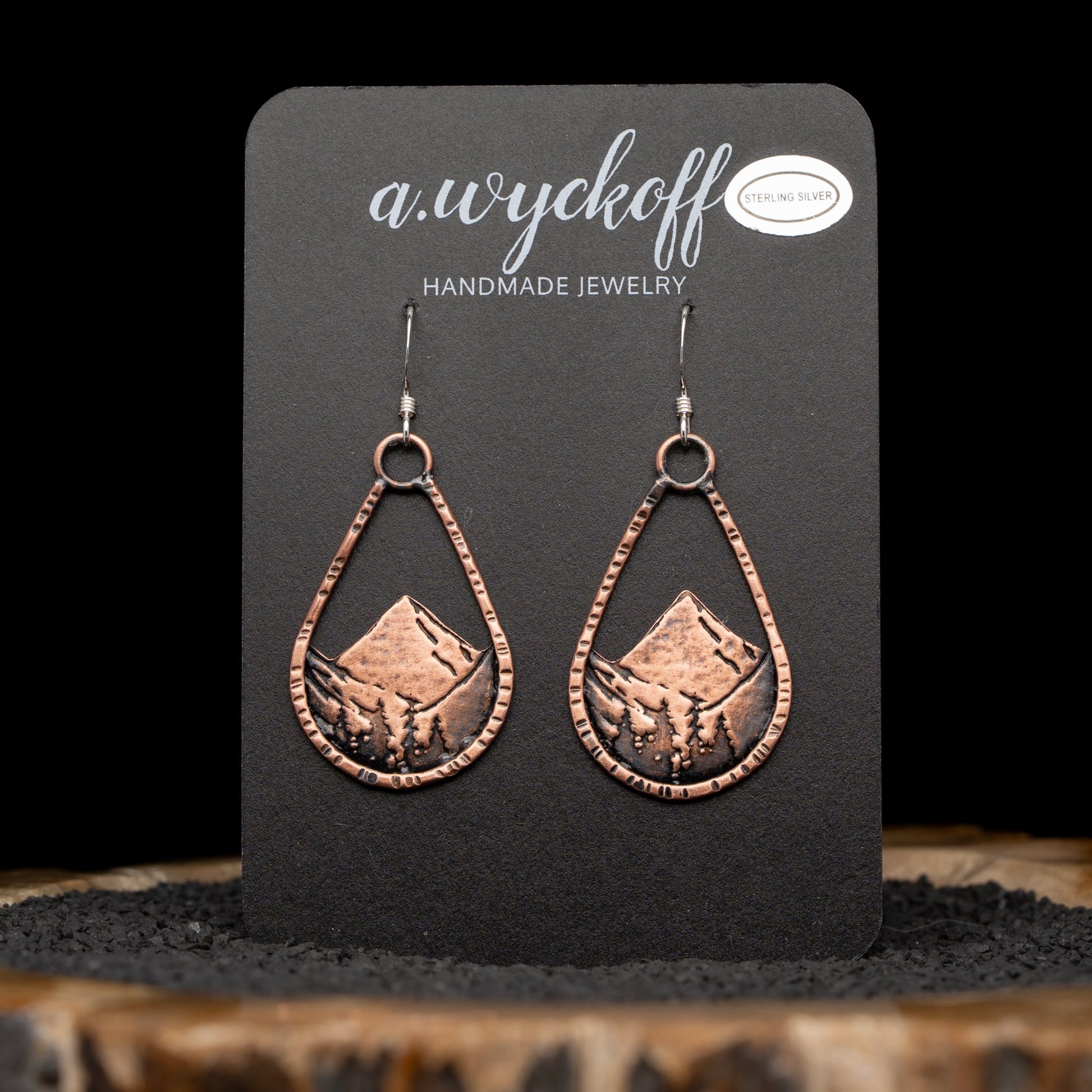 Hand formed, hammered and patterned mountain earrings. Sterling Silver French earring hooks. Treated with a skin safe lacquer to keep from tarnishing.