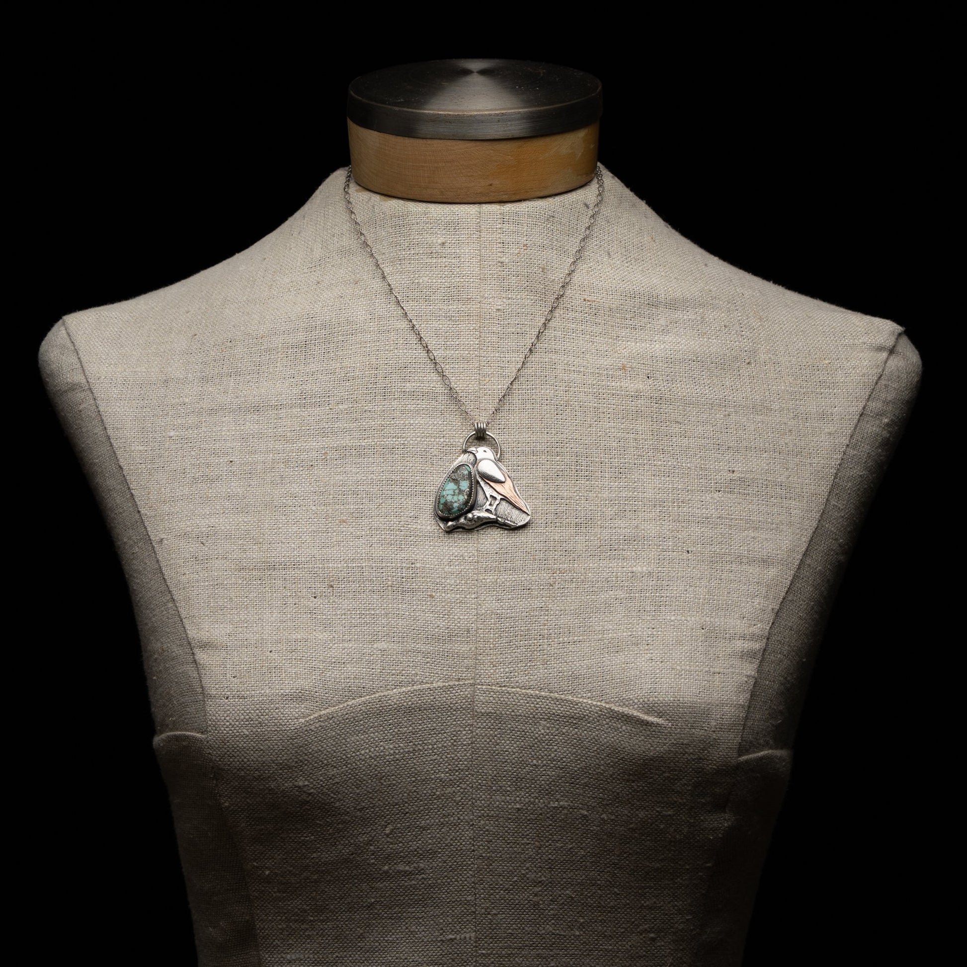 Hand fabricated Sterling Silver & Copper Raven pendant. Turquoise stone. Hand patterned back. Hangs on a 18" oxidized Sterling Silver open chain.