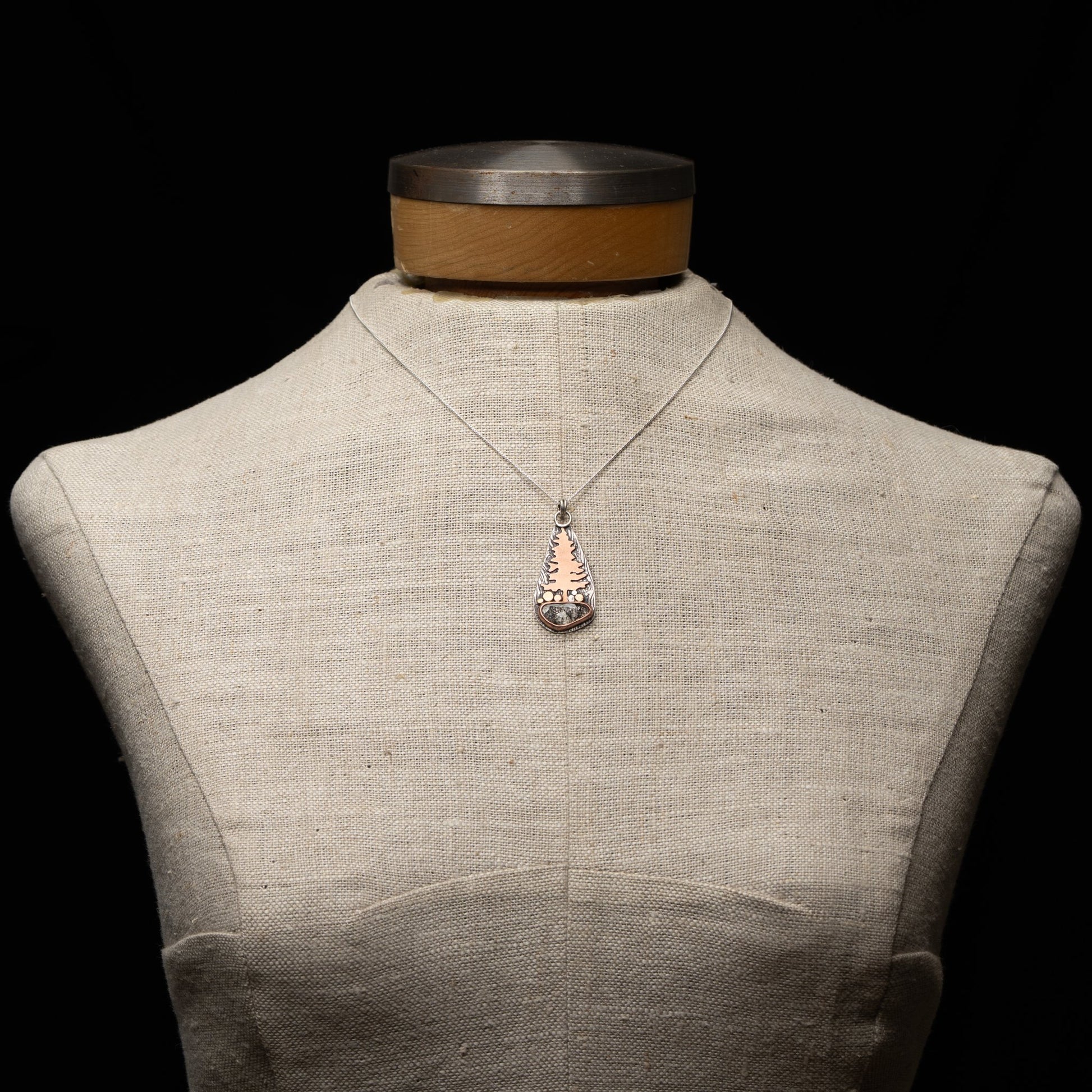 Hand fabricated Sterling Silver Pendant. Hand cut copper tree. Faceted Rutilated Quartz Stone. Handmade River Rock Accents made of silver, copper, bronze & brass. Treated with a skin safe lacquer to keep from tarnishing.