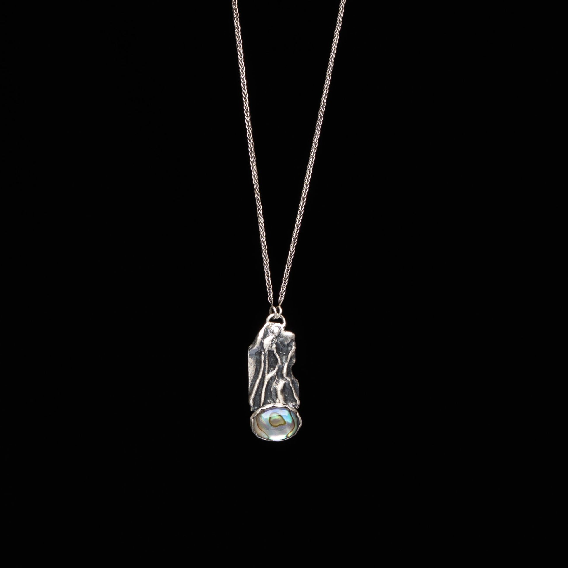 Hand fabricated Sterling Silver Necklace. Abablone & Rock Crystal. Hand patterned Silver back. Hangs on an attached 18" Sterling Silver Chain.