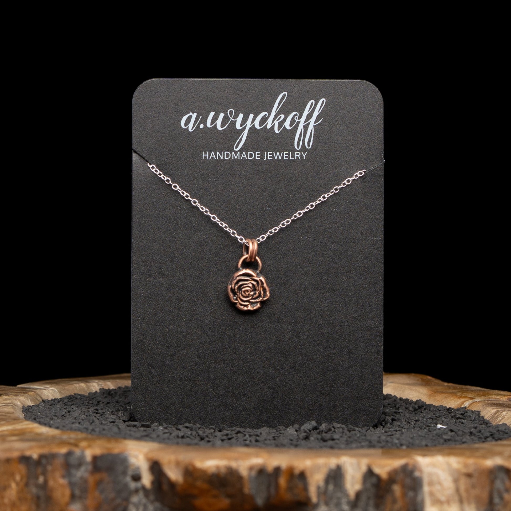 Hand fabricated Copper Rose Necklace. Hangs on a Sterling Silver 18" chain.