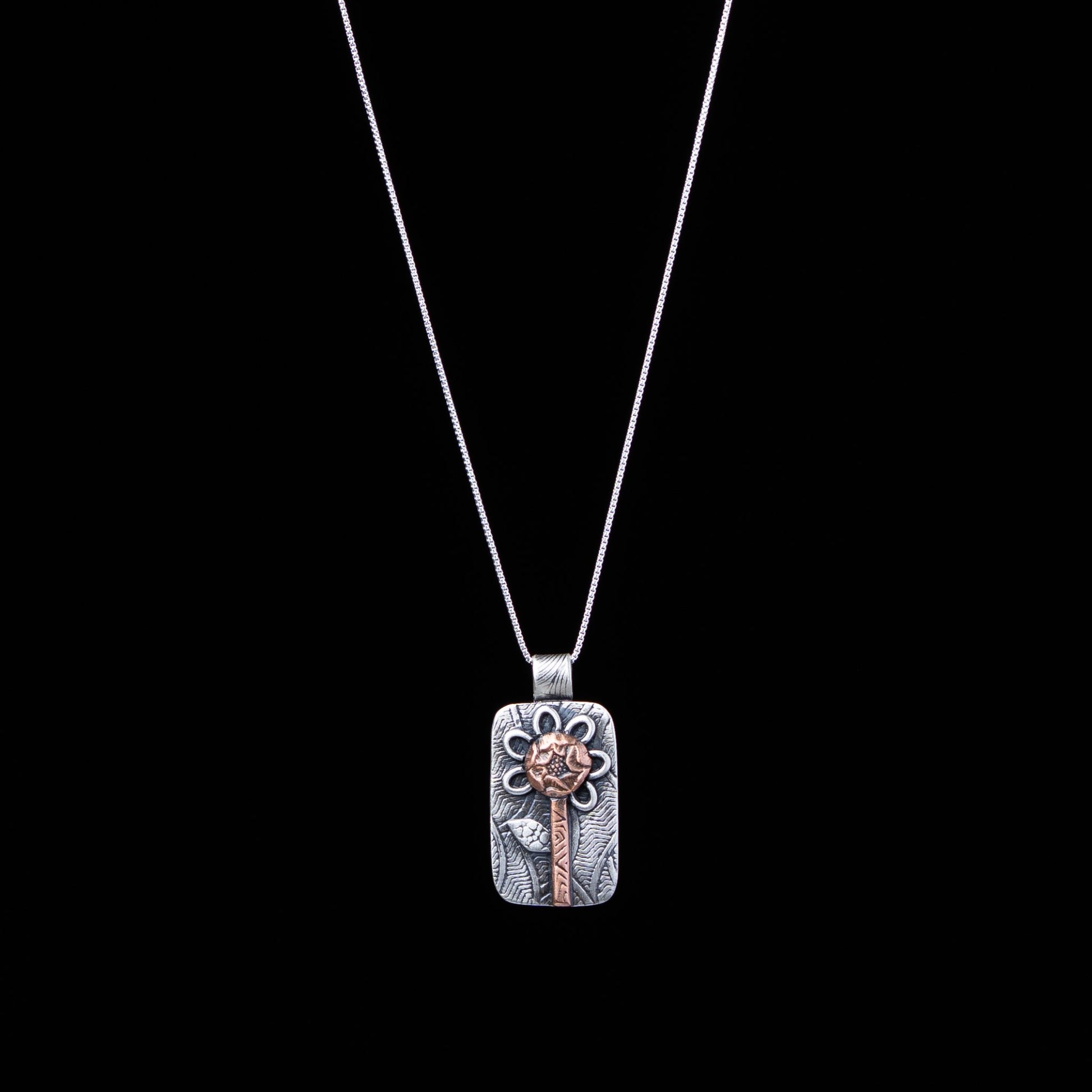 Hand patterned Sterling Silver Necklace. Hand patterned copper flower.Handmade bezel. Treated with Skin Safe lacquer to keep from tarnishing.