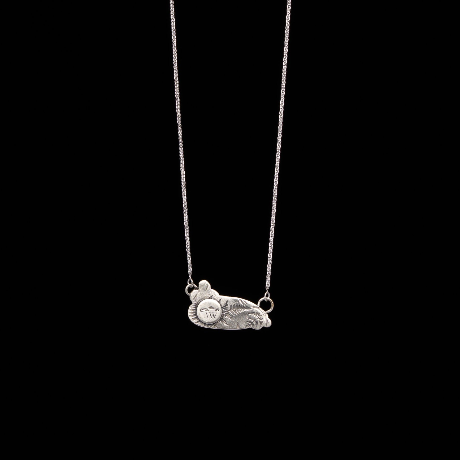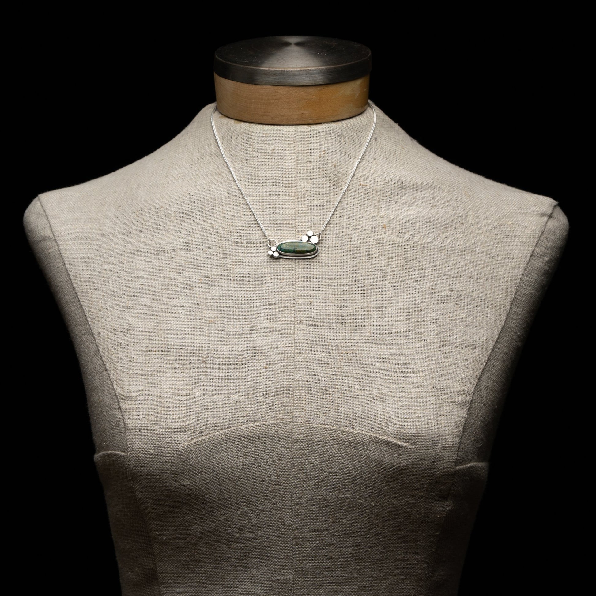 Hand formed Sterling Silver necklace. Turquoise stone. Handmade Silver accents. Hand patterned back. Treated with a skin safe lacquer to keep from tarnishing.
