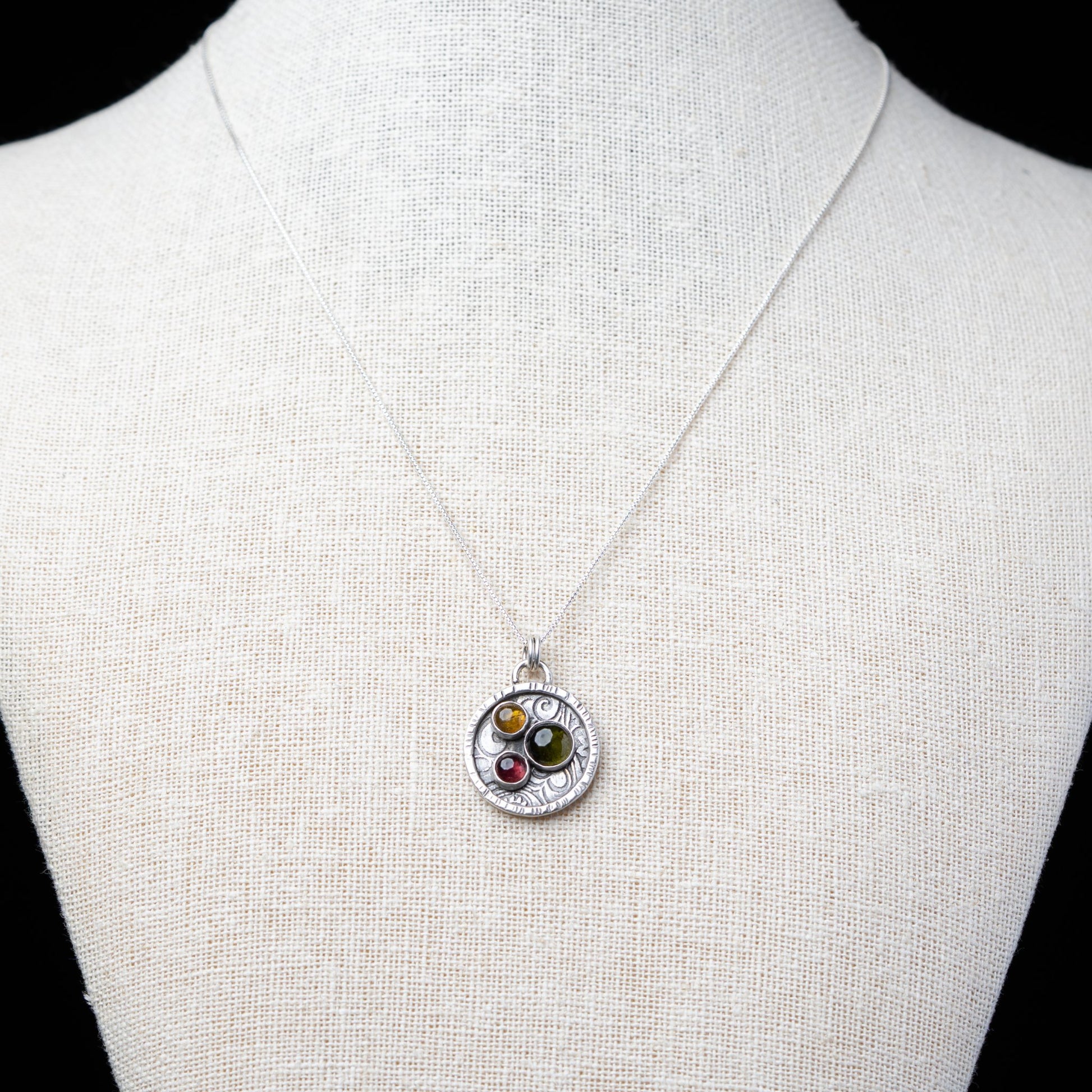 Hand patterned Sterling Silver Necklace. 3 Tourmaline Stones. Hangs on a 18" Sterling Silver Box Chain.
