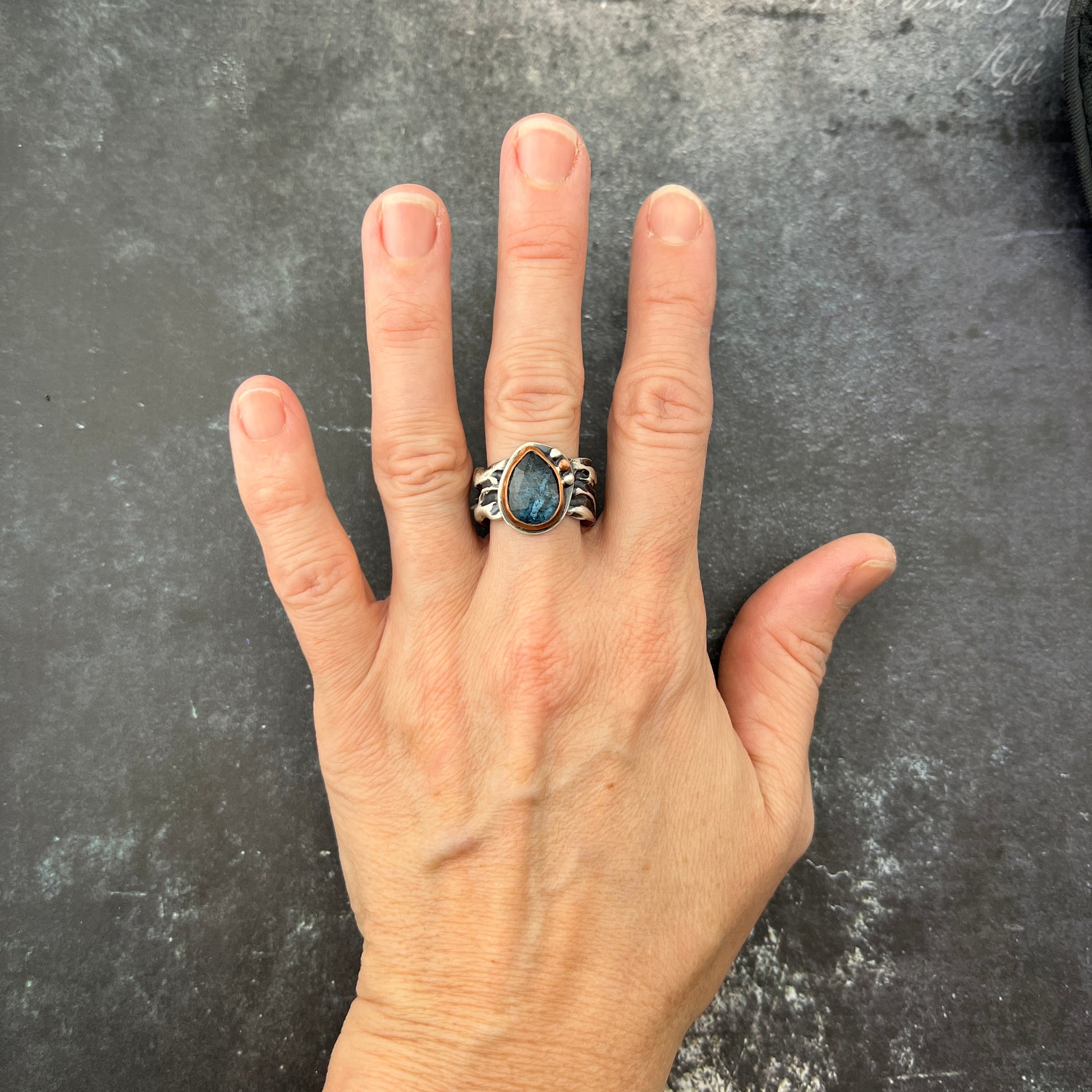 Hand fused, carved & formed Sterling Silver Band. Handmade copper bezel surrounding a faceted Kyanite stone. Silver ball accents