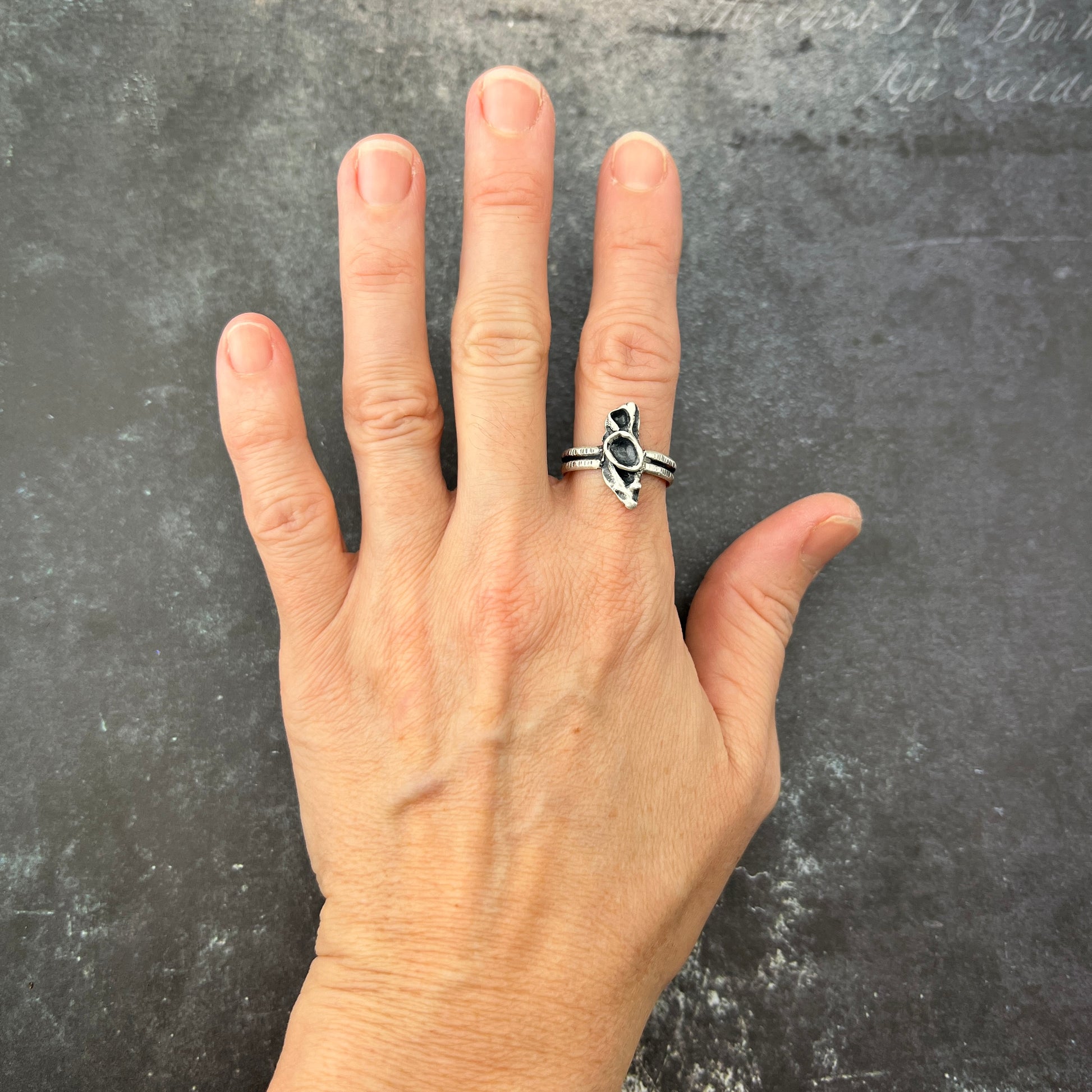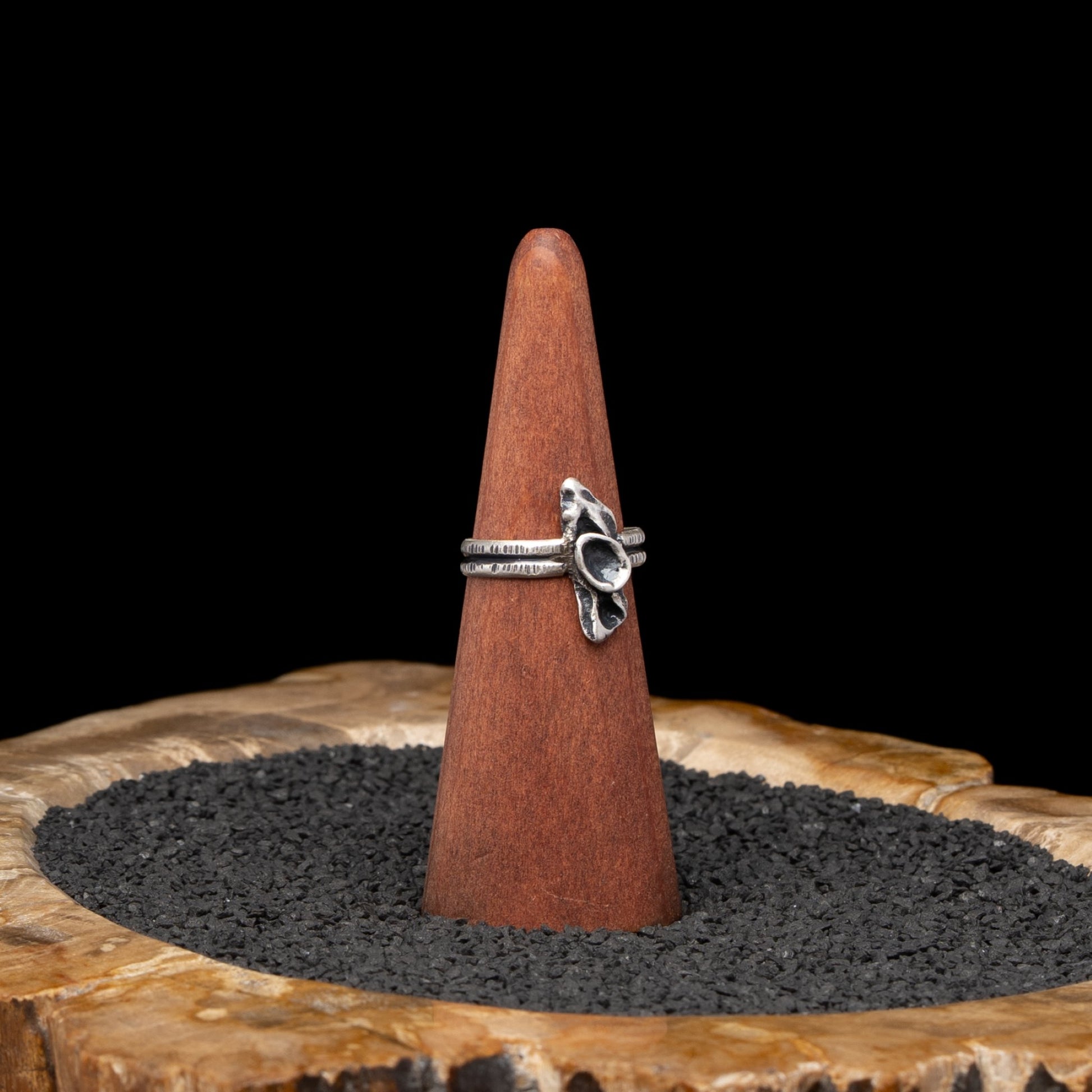 Hand fused & formed Sterling Silver ring band. Water casted cups accents.
