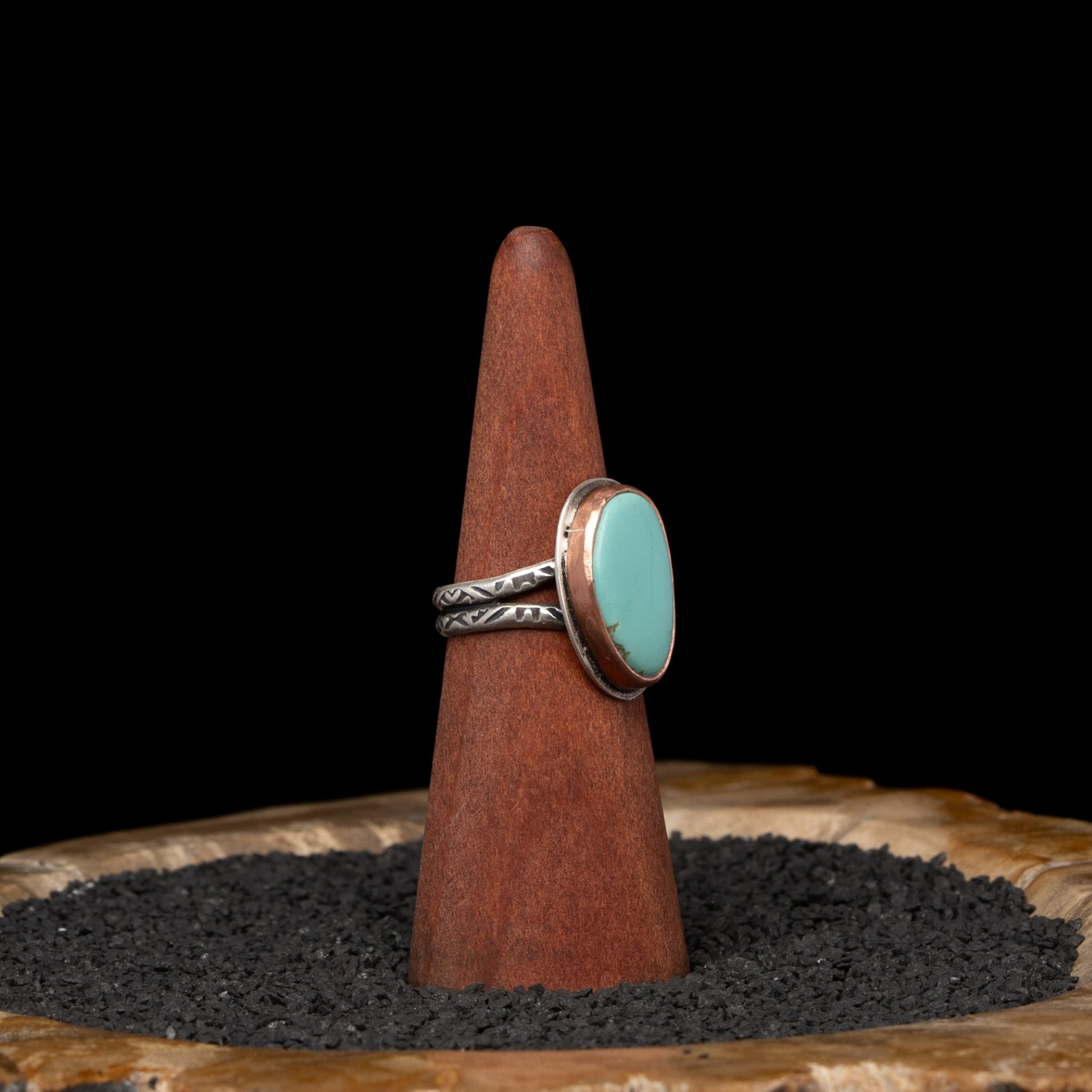 Hand patterned & formed Sterling Silver Ring. Copper bezel surrounding an Arizona Turquoise Stone.